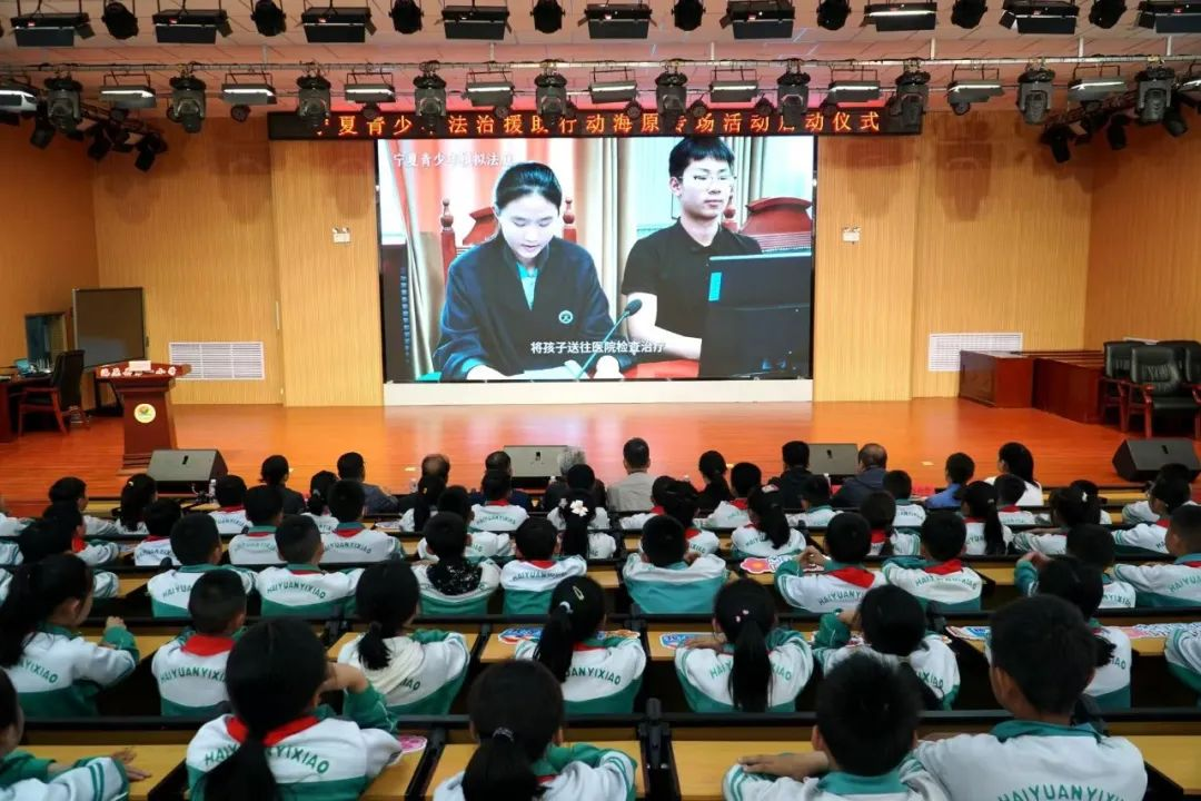 这是由自治区关心下一代工作委员会、自治区关心下一代基金会主办,海原县关心下一代工作委员会、宁夏法治报社承办的宁夏青少年法治援助行动“我是法治宣传员(小记者)”海原专场的活动现场,海原县人民法院法官助理李芳芳正在给400余名海原一小的同学上一堂法治公开课。